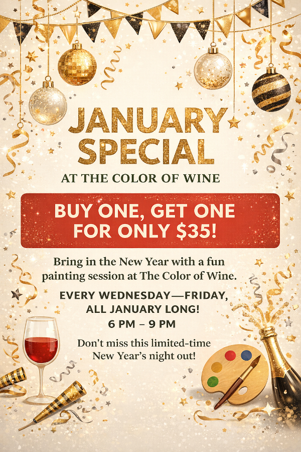 For all of January, enjoy our Buy One, Get One paint session for only $35 at The Color of Wine!